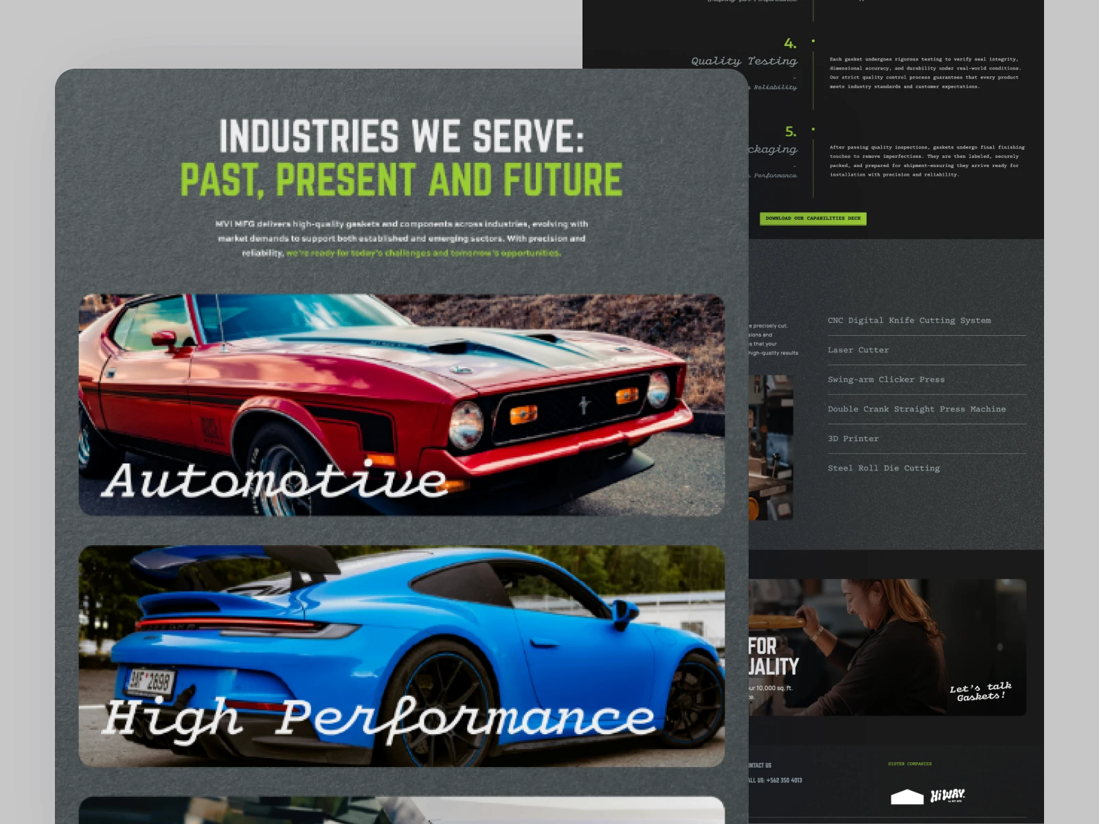 The MVIMFG project successfully communicates the company’s legacy of precision, quality, and reliability in manufacturing specialized gaskets and components. The digital presence emphasizes key differentiators such as American-made production, ISO certification, diverse material capabilities, and commitment to fast, dependable delivery. By clearly presenting its manufacturing strengths, industry reach, and certified credentials, the site reinforces MVIMFG’s position as a reputable contract manufacturing partner for both established brands and emerging sectors, ultimately supporting user trust and conversion for custom inquiries.